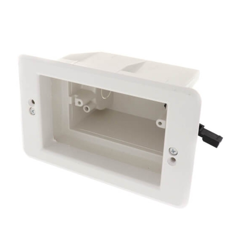 Non-metallic, recessed electrical boxes with trim plates and wall plates. Low voltage divider included for multiple gang boxes.