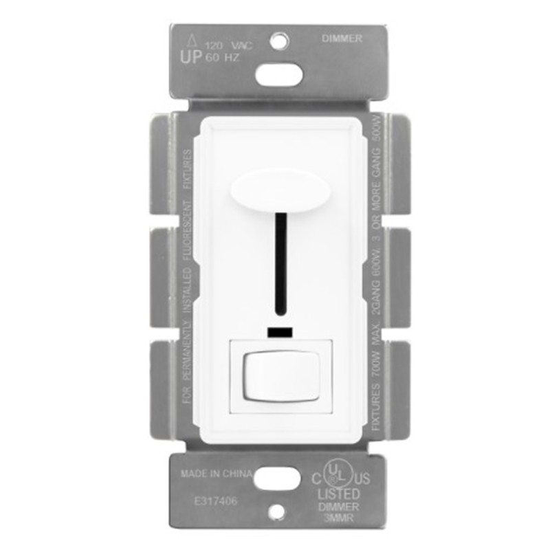 The Enerlites 50321 dimmer switch is used for 120V incandescent light bulbs. The dimmer switch features a vertical slider for brightness controls and a mini paddle switch to turn lights ON/OFF at any time. This switch can be installed in either single pole or three-way applications