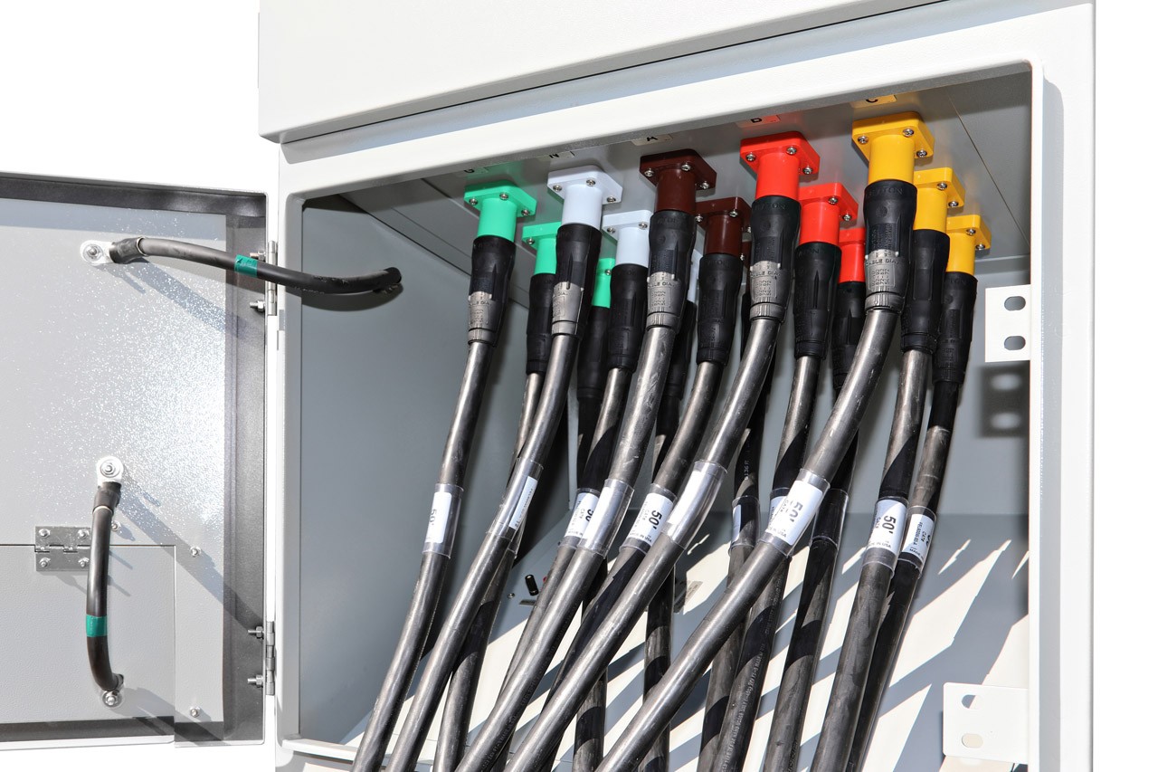 Input: (4) sets of (5) 16 Series Cam-type, 400 Amp, single pole, 600V, Green, White, Brown, Orange, Yellow, (H,H,N,N,G), panel mount inlets